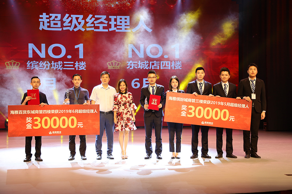 海雅商业副总经理、中山海雅缤纷城总经理王伟上台为本次颁奖典礼致辞。王总结合自身在海雅的工作经历,分享了他做为一名“海雅人”的成长史和奋斗史,并激励大家为海雅的发展增砖添瓦!随后,王伟总揭晓了商业公司2019年5-6月的超级经理人考核结果,分别是海雅缤纷城商管三楼张雄团队、海雅百货东城店商管四楼王思源团队。海雅商业常务副总经理涂雪明,海雅商业副总经理王伟一起为获奖团队颁奖,并合影留念。